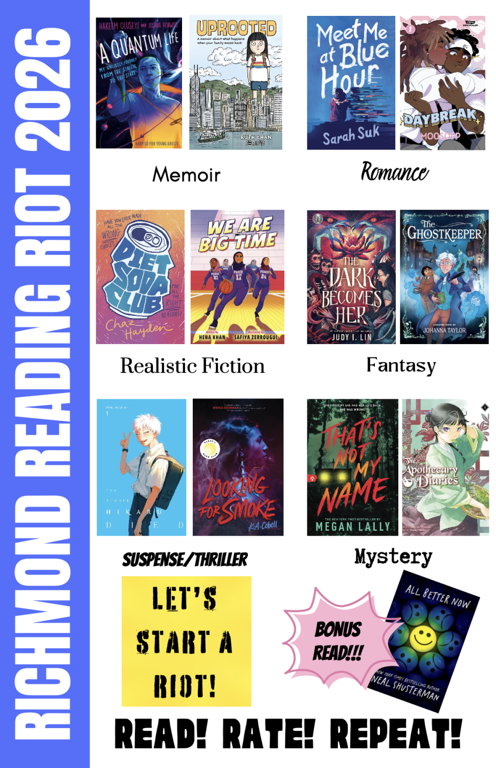 We are starting off the school year strong with the 2025 Reading Riot! For the next 13 weeks, you are challenged to read in different genres and from different perspectives for chances to win awesome prizes!